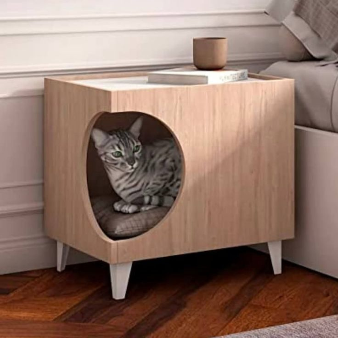 Ideal para gatos sofisticados (¡y humanos con estilo!). La cama Ellie es una fusión perfecta entre funcionalidad y diseño. Puede usarse como mesa de noche o mueble auxiliar, ofreciendo a tu mascota un espacio privado y a ti, un elemento decorativo moderno. Fabricada en madera clara, con entrada circular y patas estilizadas.