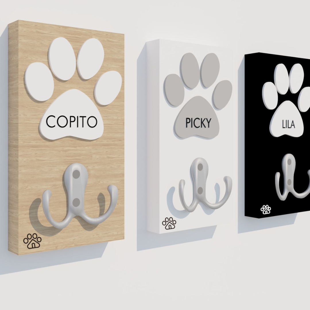 El Gancho Kenzo es un accesorio práctico y con estilo para mantener en orden los accesorios de tu peludito. Su diseño incluye una base rectangular en madera MDF enchapada con acabado natural o lacado (blanco y negro), acompañado de una huella decorativa en relieve que puedes personalizar con el nombre de tu peludito. Equipado con un gancho metálico resistente de tres brazos, es ideal para colgar correas, collares, bolsitas o incluso accesorios personales. Perfecto para ubicar en la entrada de casa o en el área de tu peludito, combinando utilidad y decoración.