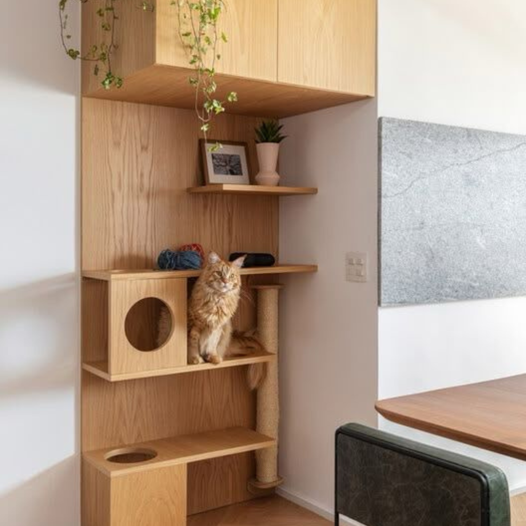 El Gym Canela es la combinación ideal entre funcionalidad para tu gato y estética para tu hogar. Integrado perfectamente a la pared, permite trepar, esconderse y rasguñar sin desentonar con tu decoración. Ideal para espacios pequeños que necesitan soluciones prácticas y con estilo.
