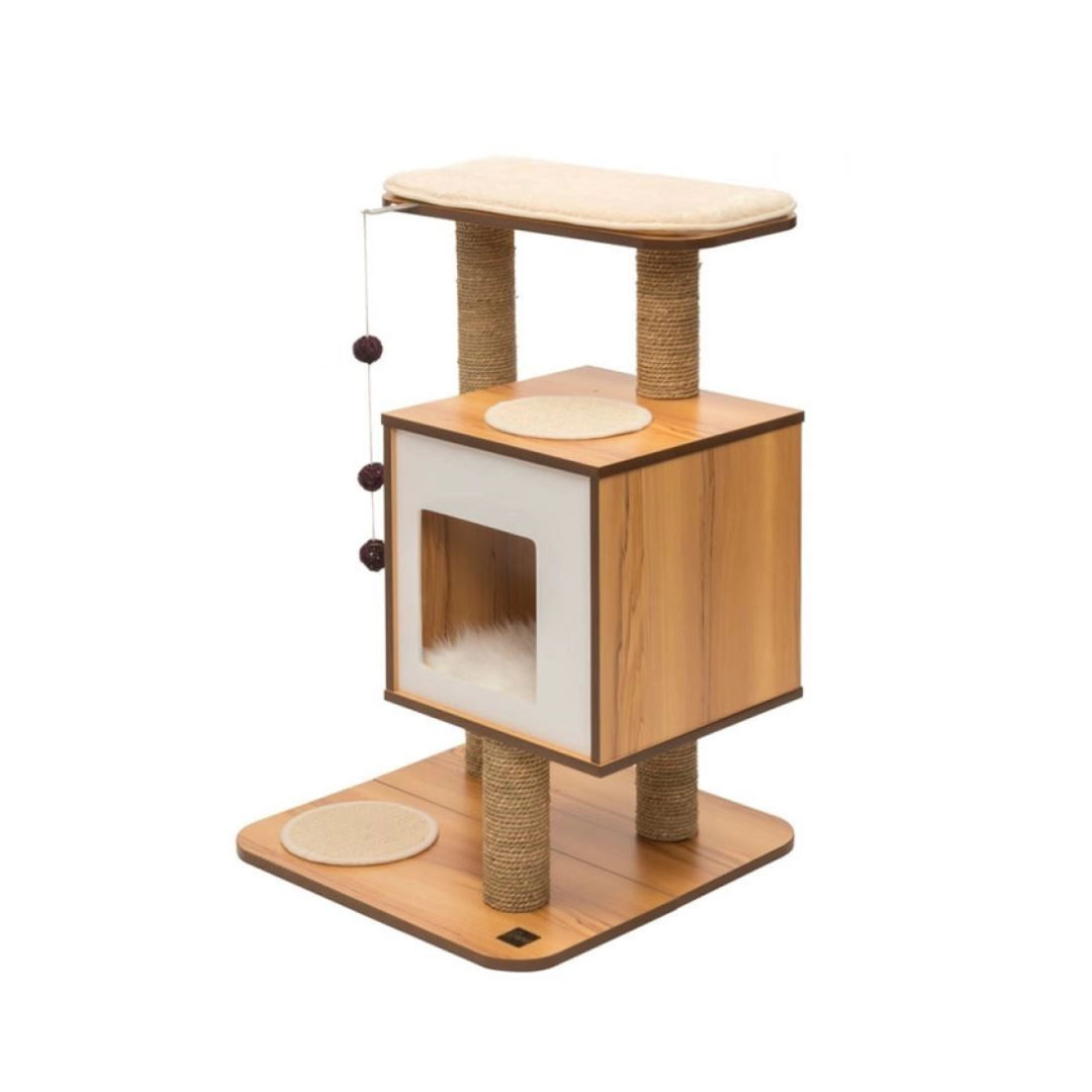 El modelo más cálido y acogedor. Gym Chispa está fabricado en madera con acabados cálidos, incluye cojines suaves, detalles en cuerda natural para rascar, y un cubo central tipo cueva. Perfecto para gatos tranquilos o mayores que buscan refugio, confort y actividad moderada.