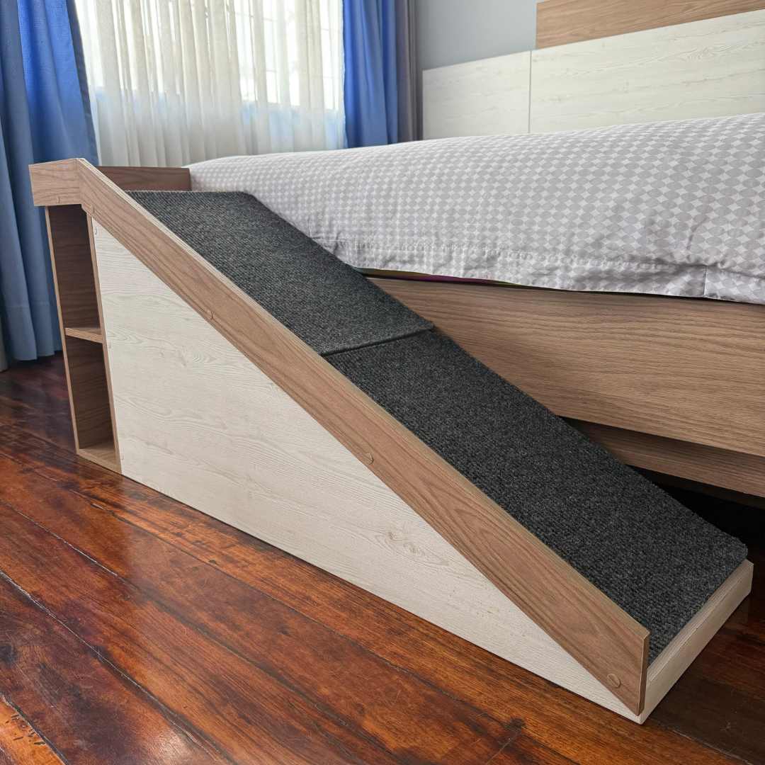 La Rampa Archie ha sido diseñada para ofrecer una solución elegante y robusta que facilite la vida de tu peludito. Gracias a su estructura cerrada con compartimentos laterales, no solo brinda estabilidad y soporte superior, sino que también añade espacio extra para organizar objetos. Su alfombra de alto tráfico garantiza un agarre seguro en cada paso, protegiendo las articulaciones de tu mascota al subir a la cama.