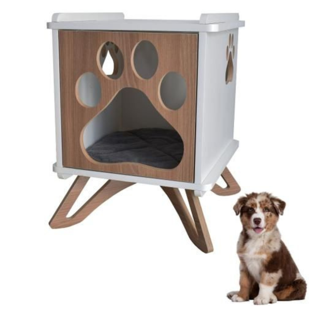 Un diseño moderno que roba miradas y conquista corazones. El Velador Frankie combina líneas geométricas con una base en forma de mecedora y una entrada en forma de huella, ideal para quienes aman el diseño tanto como a sus peluditos. Perfecto para perritos medianos que buscan su rincón especial junto a ti.